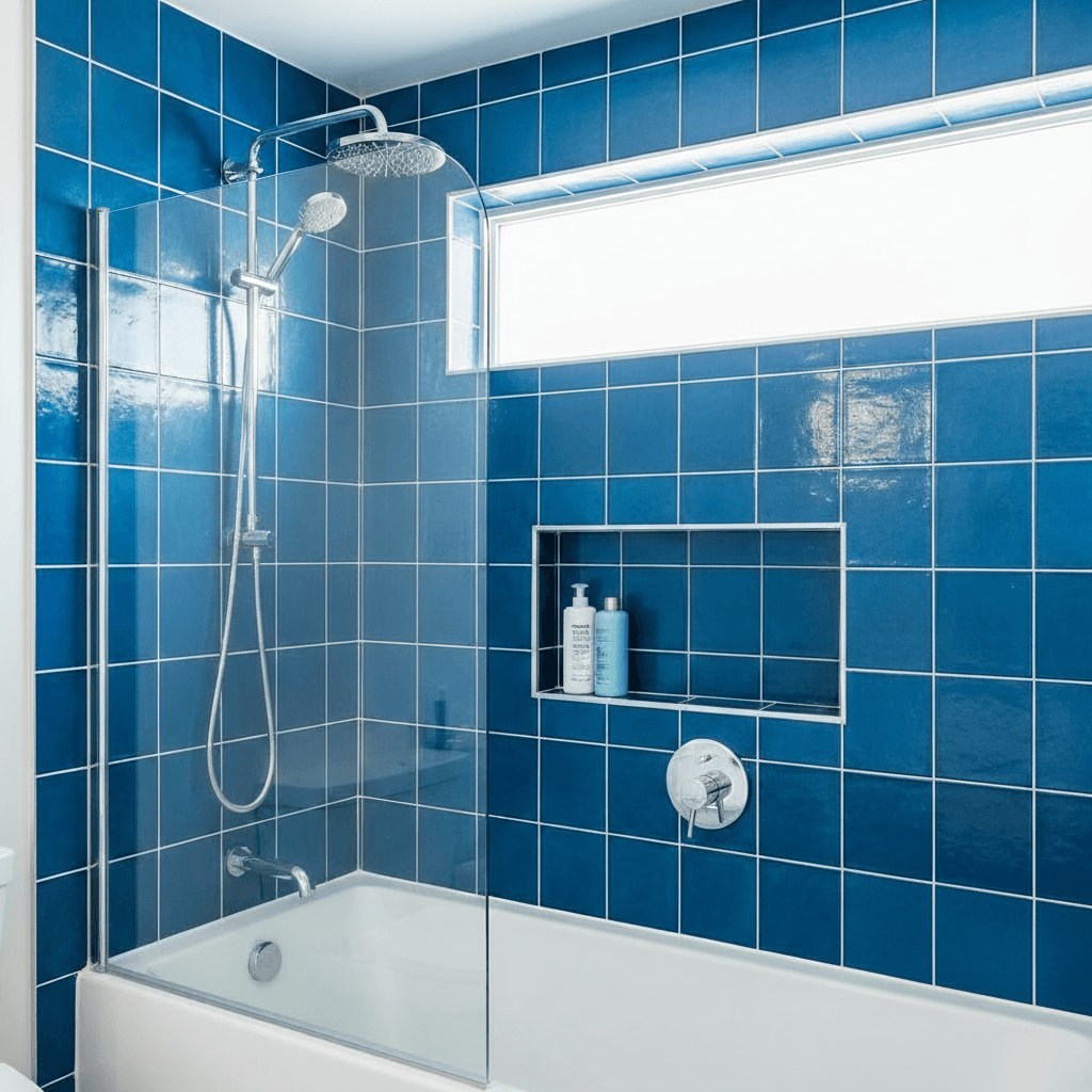 Avec des carreaux aux couleurs riches, comme ceux de cette salle de bain, le joint blanc crée un contraste plus prononcé qui apporte du dynamisme au design. Les lignes lumineuses encadrent chaque carreau, accentuant l’audace de la couleur et la géométrie de la pose. Cette approche met en valeur l’éclat des carreaux, en faisant un véritable point d’orgue tout en maintenant un sentiment d’équilibre et de clarté dans l’espace.
